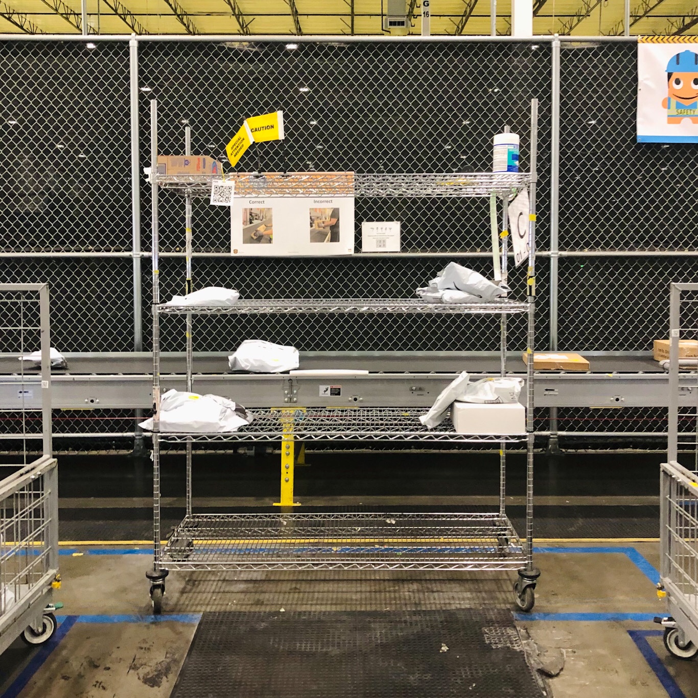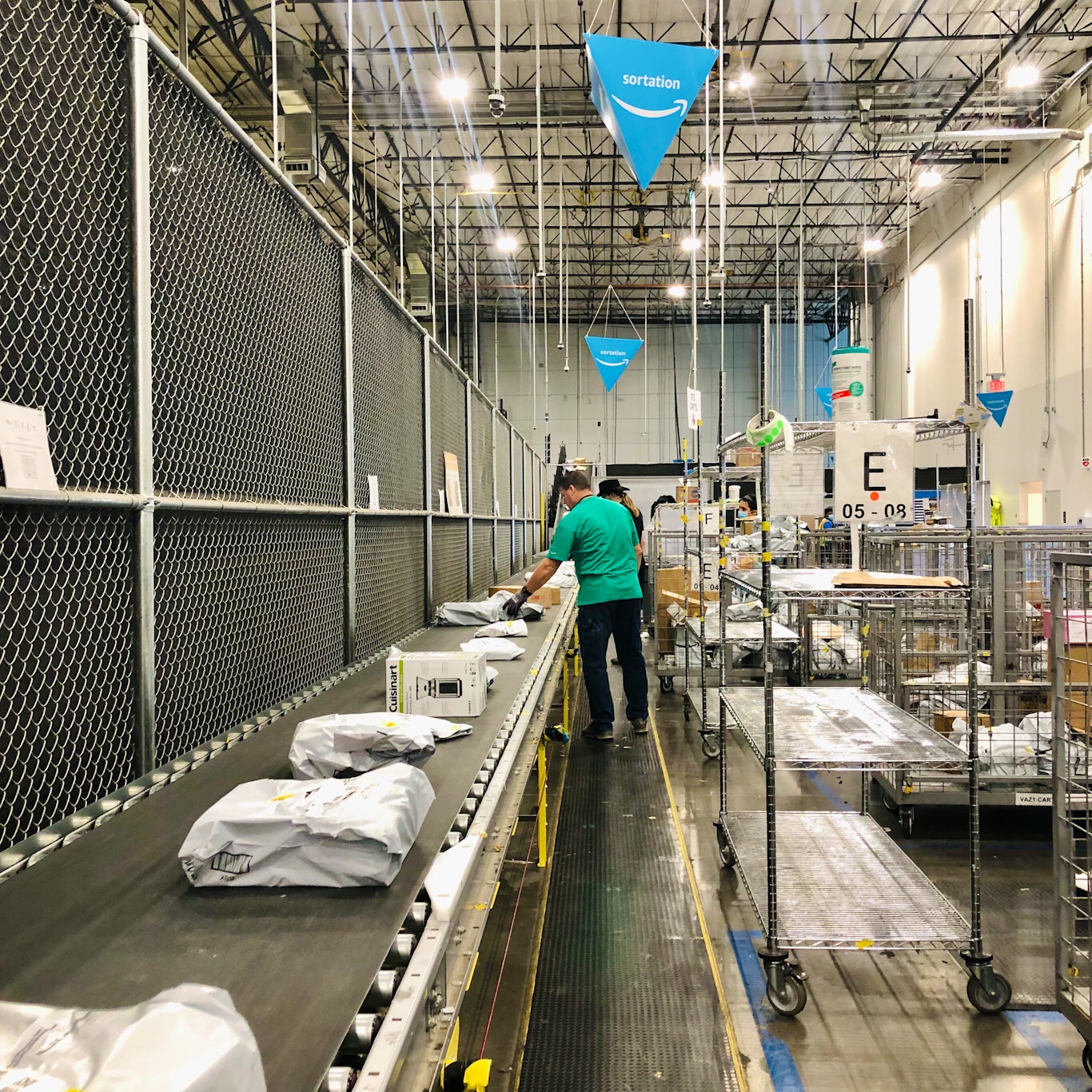 I’m assigned to Dispatch. Within Dispatch, you have Buffers, Stowers and Stagers, and everyone does a little of each. Buffers remove the packages from the conveyer (first picture) and place them on shelves within the work station. Stowers remove the packages from the shelves (second picture) and place them in carts according to assigned routes. Stagers move the carts from the stowing station and move them to the staging area for drivers to pick up and then deliver.